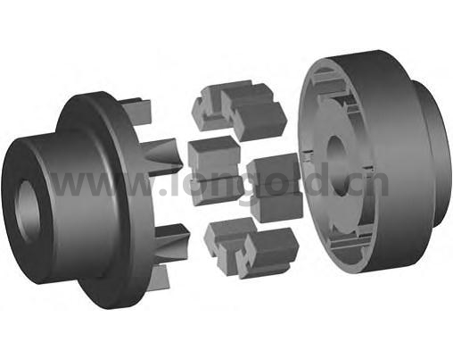 ◎ 橡膠塊聯軸器指的是利用若干塊狀橡膠元件嵌在兩半聯軸器的相應槽內,以實現兩半聯軸器彈性聯接的聯軸器。